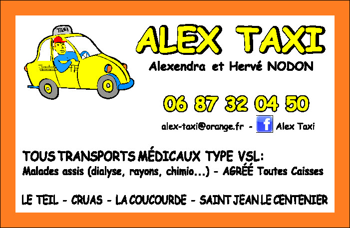 AccueilPratiqueAdresses utilesCommerces Alex Taxi Alex Taxi Tous transports médicaux type VSL : malades assis. Agréé toutes caisses. Une équipe a votre service 365 j/ an Transport sur les communes de Le Teil, Cruas, la Coucourde et St Jean Le Centenier Alex Taxi 07350 Cruas