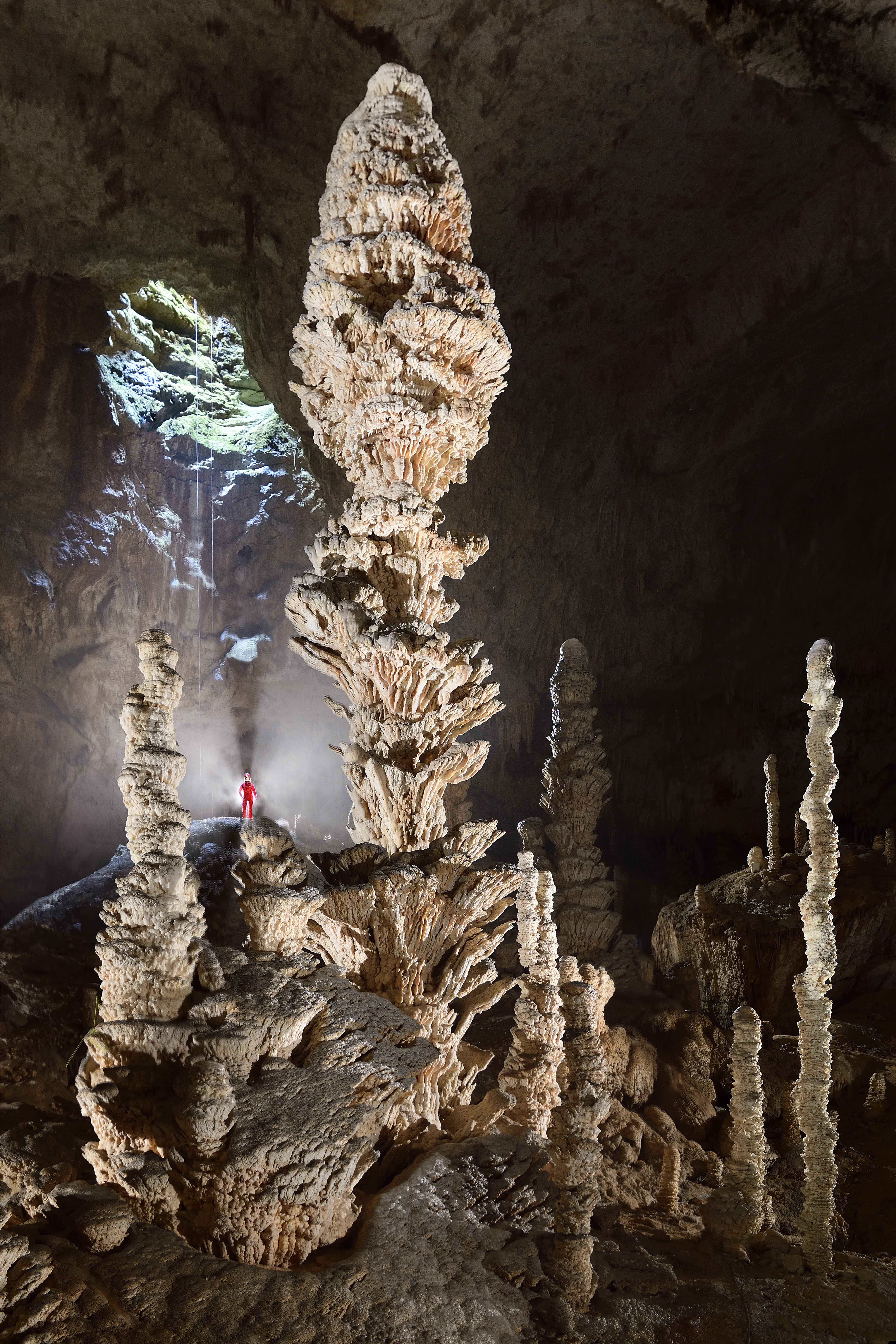 L’exploration entraîne le visiteur dans trois immenses galeries, sous des plafonds culminant à 55 m, où palmiers géants, draperies ocrées, colonnes, buffets d’orgue et agencements cristallins dessinent un monde silencieux, sculpté dans l’obscurité.