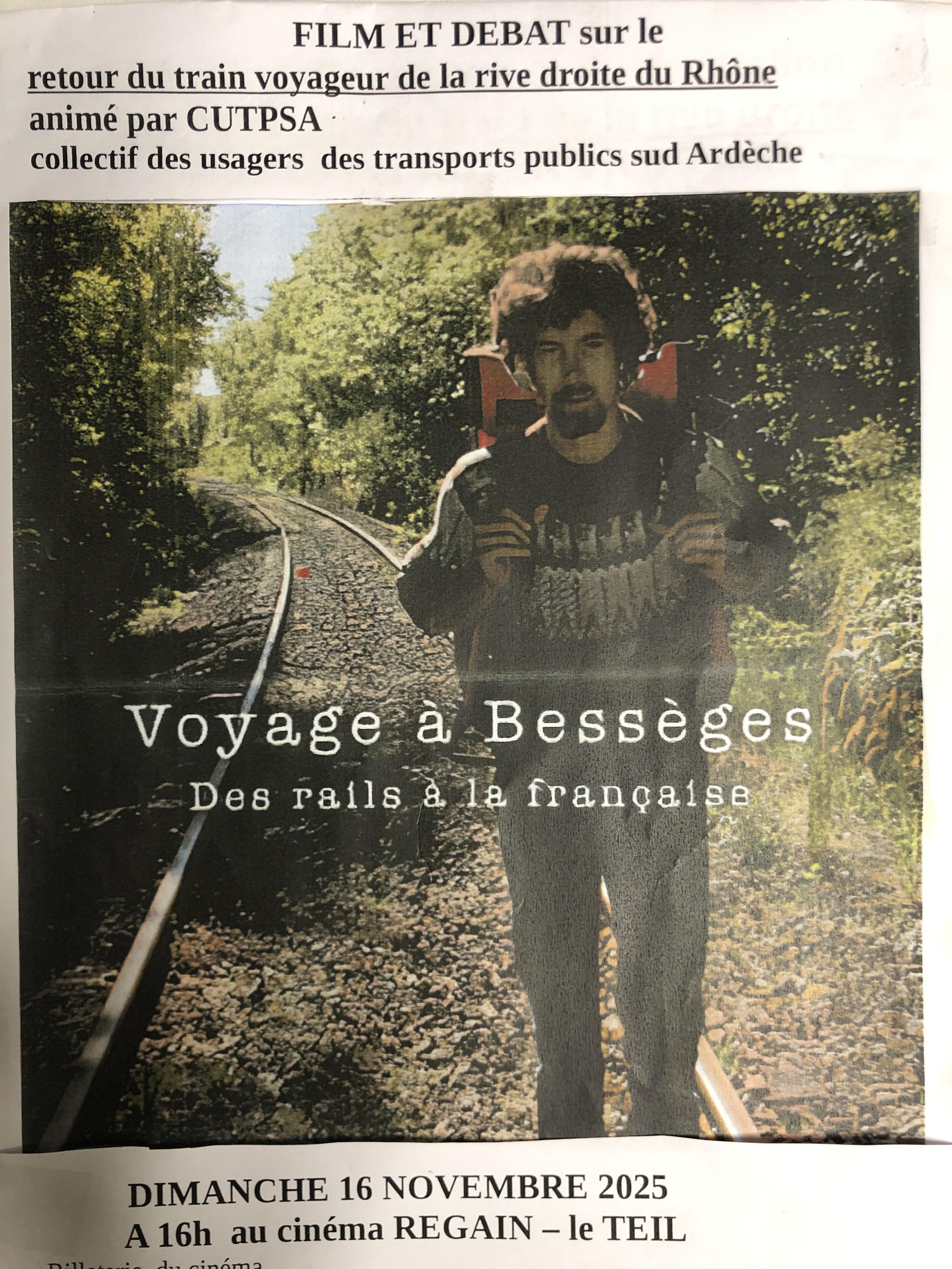 L’Association CUTPSA , collectif des usagers de transport public en sud Ardèche, et l'association AuterVR, association des usagers du TER de la vallée du Rhône relancent leur demande du retour des trains de voyageurs sur la rive droite. Après le report de l'évènement "Train en fête "prévu le 16 novembre et reporté en 2026, par refus de la SNCF de prévoir des arrêts en gare, elles maintiennent la pression avec la projection du film Voyage à Bessèges , suivie d’un débat.