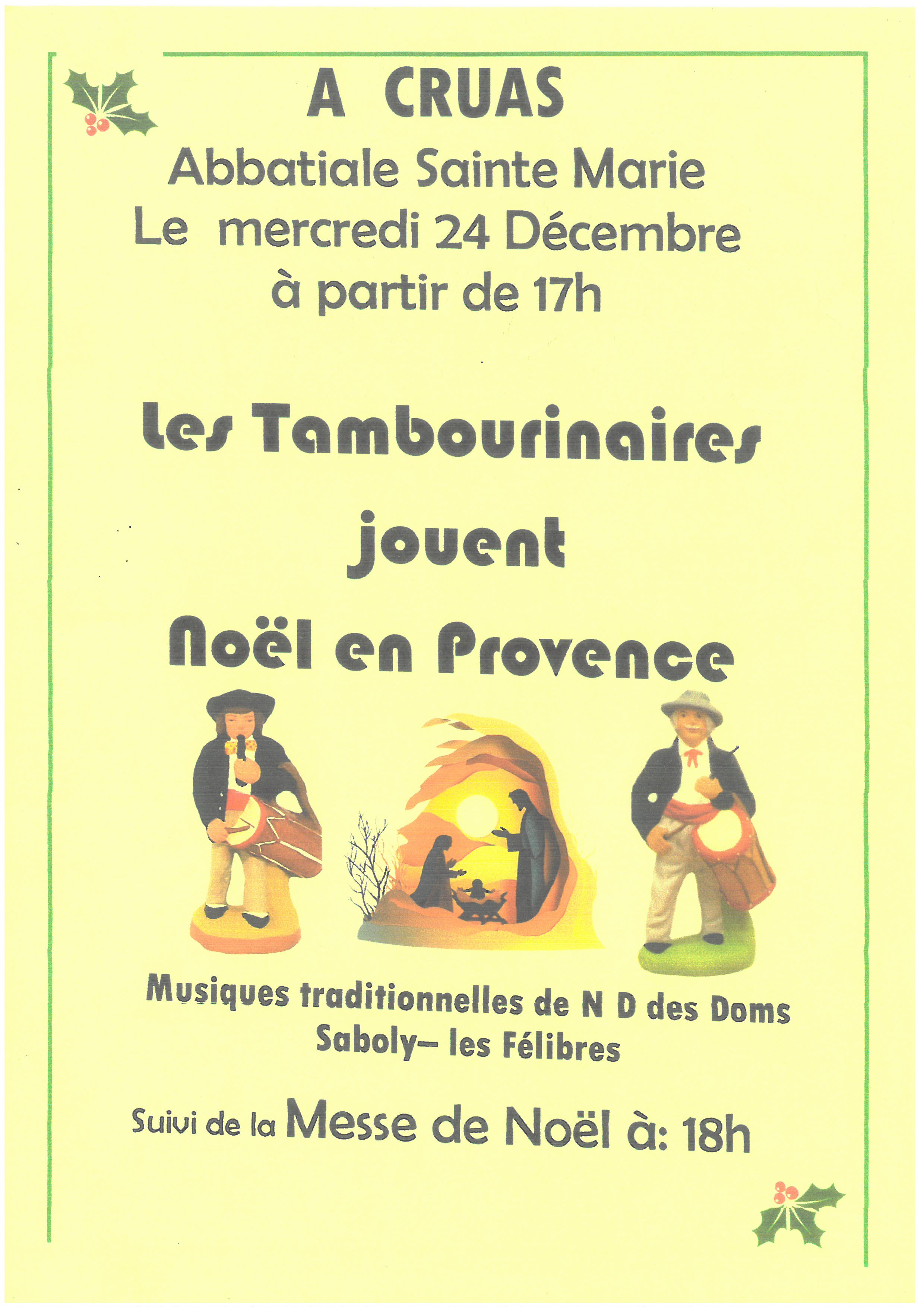 Les tambourinaires interprètent “Noël en Provence” dans l’abbatiale Sainte-Marie de Cruas, avec des musiques traditionnelles de N.-D. des Doms Sabody - les Félibres, suivi de la messe de Noël.