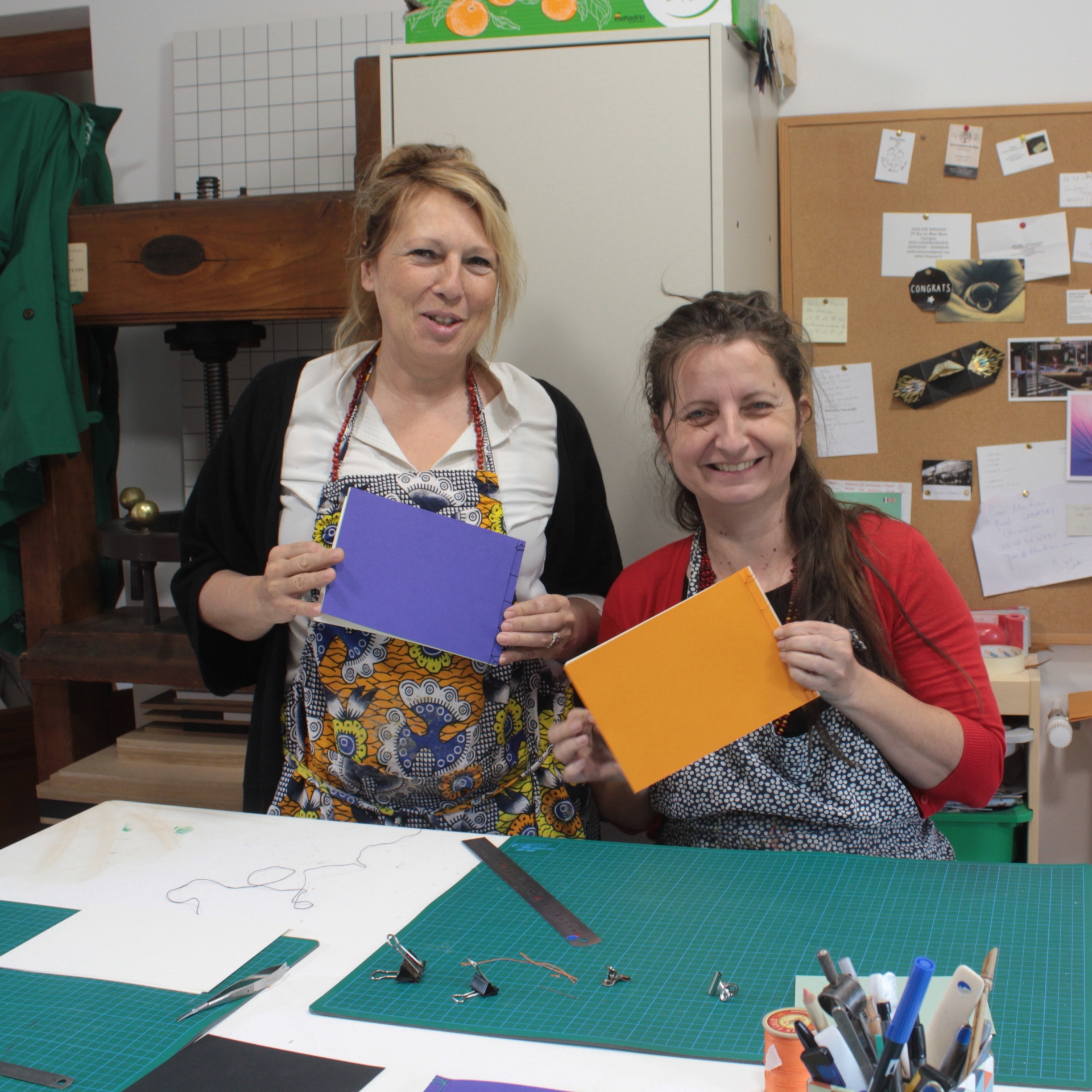 Au terme de l'atelier, vous repartirez avec vos deux carnets A5 personnalisés, un avec une couverture souple et l'autre en carton rembordé d'un papier décoré.