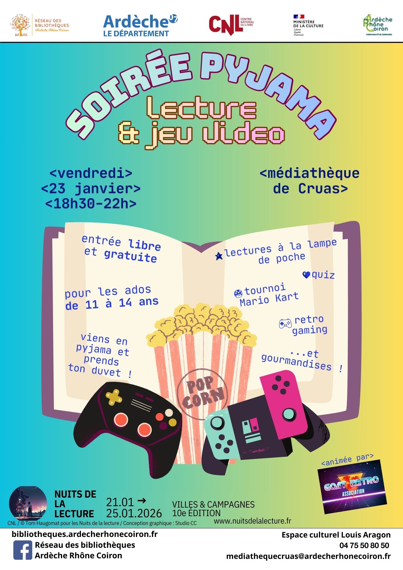 Le réseau des bibliothèques Ardèche Rhône Coiron vous invite à une soirée pyjama dans le cadre des nuits de la lecture 2026. Ce soir, la médiathèque appartient aux ados ! (lire plus)