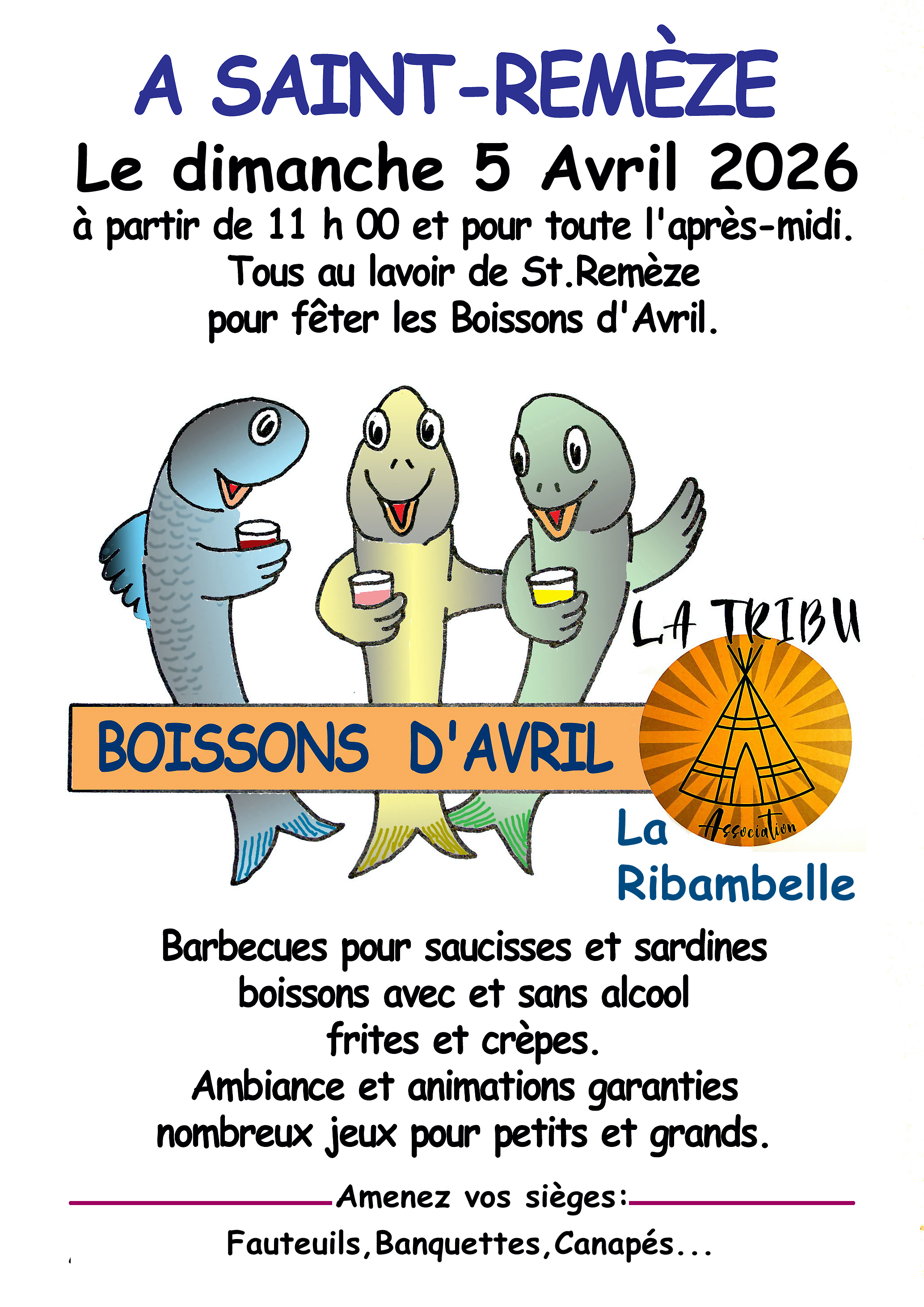 AccueilSe divertirAnimations et festivités Les boissons d'Avril avec Marché Les boissons d'Avril avec Marché Sardinade, Saucisses, frites, crêtes, boissons, pêche aux canards, musique, animations pour enfants et adultes. Tarifs / ouverturesOuverturesDimanche 5 avril 2026 de 11h à 18h.TarifsGratuit. Les boissons d'Avril avec Marché Lavoir de Saint RemézeLavoir de Saint Reméze 07700 Saint-Remèze