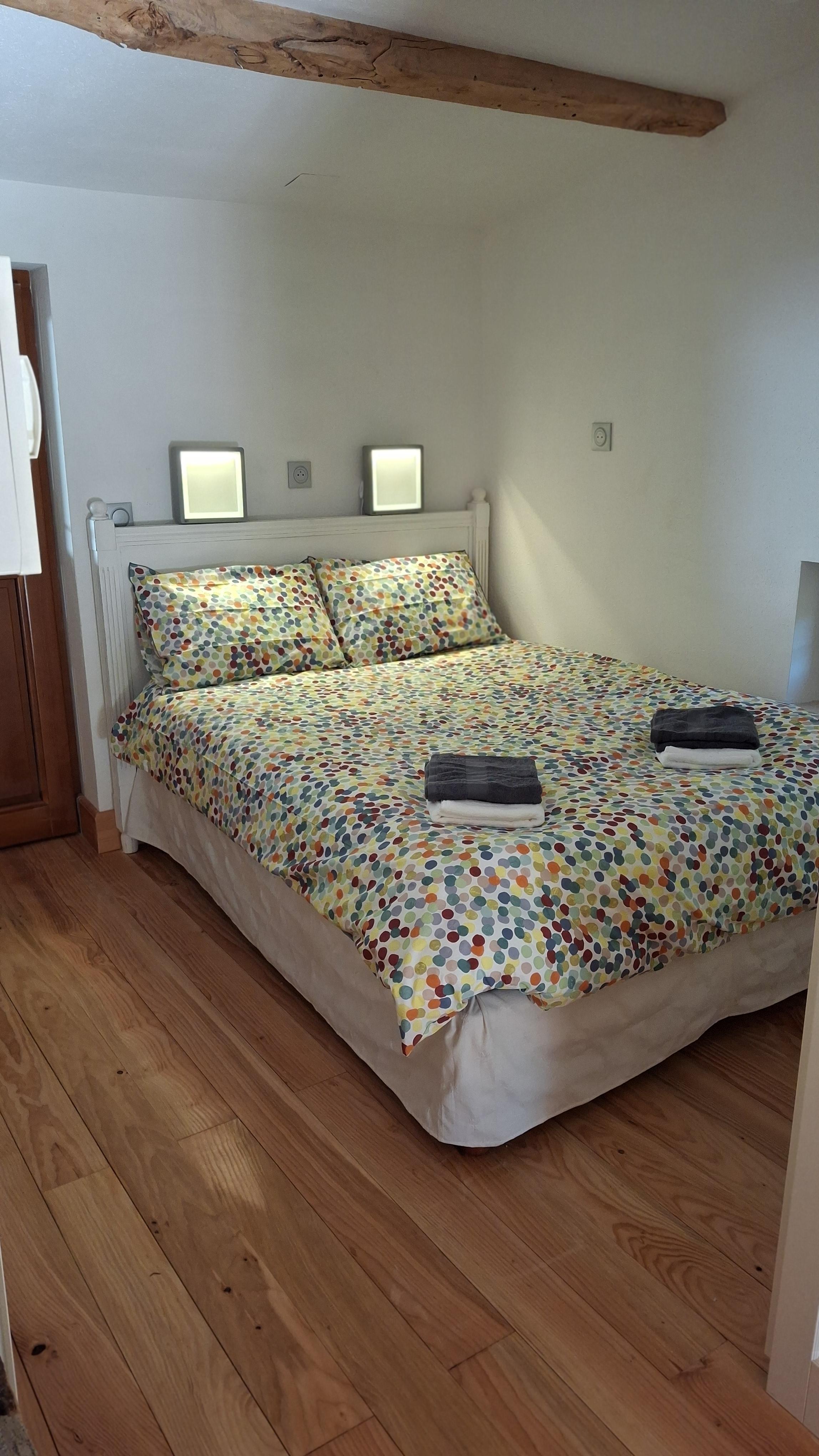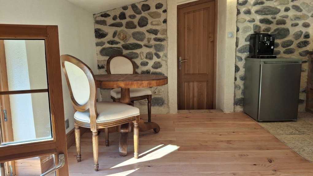 Un lit double confortable, un canapé lit 2 places, une salle d'eau (douche à l'italienne), une cuisine toute équipée, ... et sa terrasse couverte qui donne directement sur la cour commune et la nature environnante.