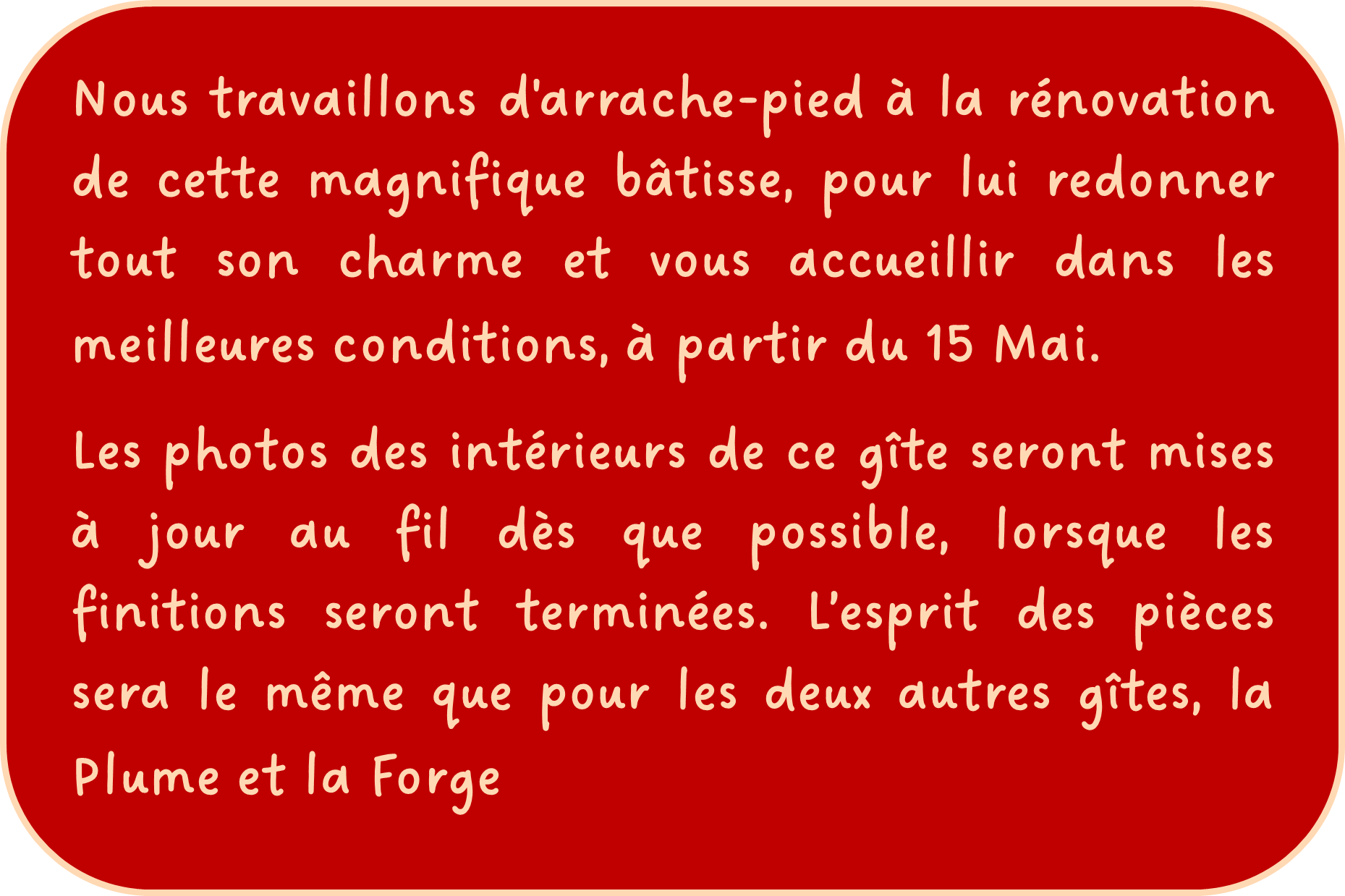 Nous travaillons d'arrache pied à la rénovation de cette magnifique bâtisse, pour redonner tout son charme à ce lieu et pouvoir vous accueillir dans les meilleurs conditions.